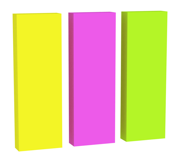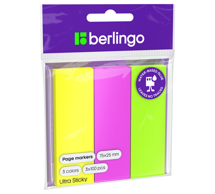 Флажки-закладки бумажные самоклеящиеся Berlingo «Ultra Sticky» размером 25х75 мм и повышенной клейкостью 25 Н/м. Изготовлены из бумаги плотностью 75 г/м2. Праймер слой, удерживающий клей при переклеивании, позволяет не оставлять следов на поверхности и многократно использовать лист. Специальное покрытие, предотвращающее закручивание, оптимизированное для комфортного письма. Идеальны для наклеивания на различные типы поверхностей. Упаковка 300 листов, 3 неоновых цвета по 100 листов каждый: желтый, розовый, зеленый. Упаковка в прозрачный ПВХ-пакет с европодвесом, с возможностью быстрого открытия. Производство - Германия.