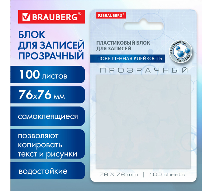 Стикеры Brauberg 76х76мм, пластиковые, прозрачные, 100л