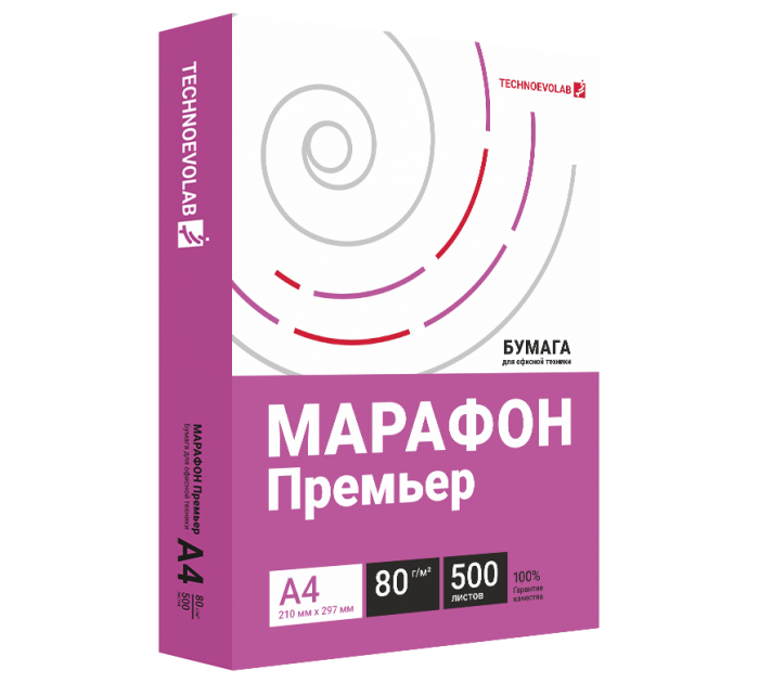 Бумага высшей категории (класс А) Техноэволаб Марафон Премьер — один из лидеров по качеству среди офисной бумаги для печати и копирования документов. Отличается высокими техническими показателями: белизной, яркостью, толщиной, непрозрачностью листов, благодаря чему техника прослужит дольше, а расход тонера сократится. Производится в соответствии с международными стандартами качества ISO 14001 и системой экологического менеджмента и аудита EMAS. Идеальное качество черно-белой и цветной печати на лазерных и струйных принтерах. Подходит для двусторонней печати. Не содержит древесных смол и элементарного хлора. Белизна CIE по ISO 11475 162 (+/-2). Толщина по ISO 534 (ГОСТ 27015) 110мкм (+/-3) микрон обеспечивает отсутствие двойных захватов.