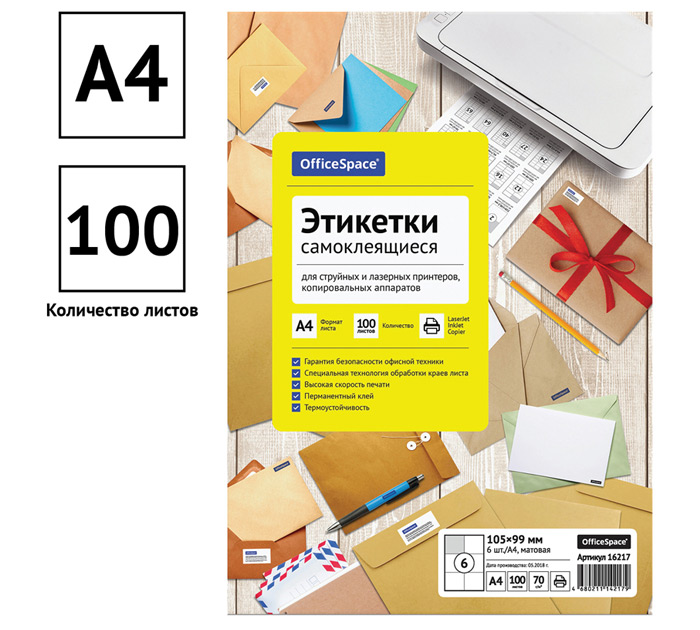 Бумага самоклеящаяся OfficeSpace А4, 6 этикеток, 105х99мм, 70г/м2, 100л