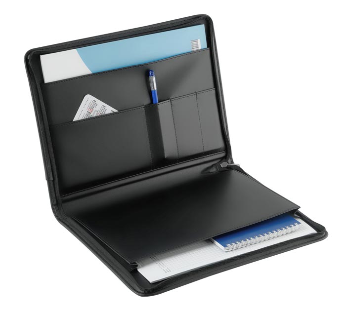 Деловая папка для документов формата А4 из искусственной кожи. Папка создана в лаконичном дизайне без ручек, закрывается на молнию. Внутри отделения для бумаг, карманы для визиток. Размер 340х270 мм. Цвет – черный.