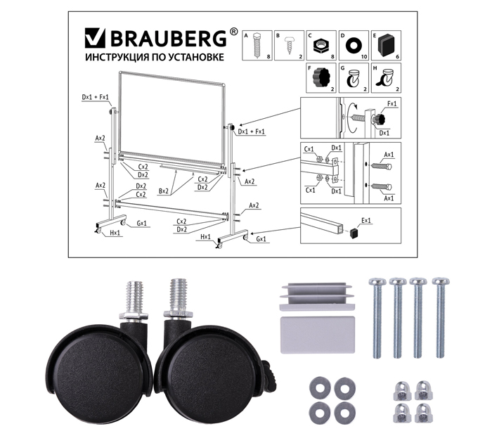 Двусторонняя магнитно-маркерная доска на стенде Brauberg предназначена для наглядной демонстрации графической информации при проведении презентаций, совещаний, лекций, семинаров, тренингов и других мероприятий. Лаковое покрытие предназначено для письма специальными маркерами для белой доски, а металлическая поверхность позволяет размещать информацию при помощи магнитов. Вращается в горизонтальной плоскости на 360°. Перемещается на колесиках. Алюминиевая рама придает доске необходимую прочность. Подставка для канцелярских принадлежностей позволяет всегда держать под рукой магниты, маркеры, стиратели и другие необходимые предметы. Элементы крепления входят в комплект. Защитная пленка предупреждает появление царапин, потертостей и сколов на рабочей поверхности доски при транспортировке и хранении продукции (перед началом работы необходимо удалить защитную плёнку). Размер: 100х150 см.