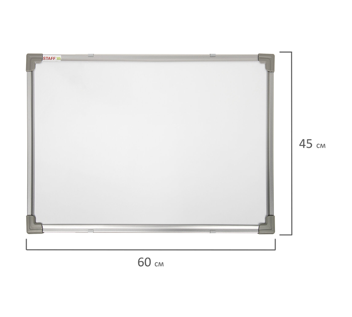 Магнитно-маркерная доска STAFF ECO предназначена для проведения совещаний и презентаций в офисах, коммерческих организациях и учебных заведениях. Лаковое покрытие предназначено для письма специальными маркерами для белой доски, а металлическая поверхность позволяет размещать информацию при помощи магнитов. Доска надежно крепится к стене при помощи идущих в комплекте кронштейнов. Укреплённые пластиковые уголки позволяют скрыть места крепления к стене. Металлический профиль цвета анодированного алюминия придает изделию дополнительную прочность и современный стильный внешний вид. Защитная пленка предупреждает появление царапин, потертостей и сколов на рабочей поверхности доски при транспортировке и хранении продукции (перед началом работы необходимо удалить защитную плёнку). Без лотка для аксессуаров. Размер: 45х60 см. Надежная упаковка: картонная коробка. Тип доски: односторонняя. Размер доски (ВхШ): 45х60 см. Максимальная ширина доски: 60 см. Высота в сборе: 45 см. Покрытие рабочей поверхности: лаковое. Материал рамы: сталь. Серия: Eco. Укреплённые пластиковые уголки: да. Разметка: нет. Комплектация: элементы крепления. Тип крепления: закрытый. Материал рабочей поверхности: сталь. Вес: 2 кг. Бренд - STAFF. Производитель - Россия.