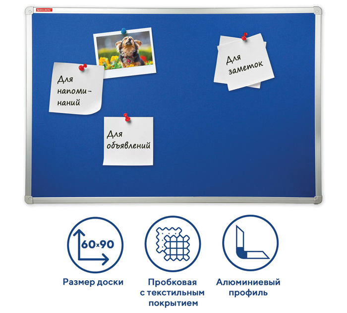 Пробковая доска с текстильным покрытием BRAUBERG позволит разместить объявления при помощи кнопок и офисных булавок. Широко используется как в организациях различного рода деятельности, так и в домашнем обиходе. Текстильное покрытие поверхности, изготовленной из натуральной пробки имеет улучшенную алюминиевую рамку и укрепленные уголки. Размер доски- 60х90 см. Цвет текстильного покрытия: синий. Возможность горизонтального и вертикального размещения доски. Крепится к стене, элементы крепления и кнопки-гвоздики входят в комплект. Гарантия 10 лет. Отверстия в пробке «закрываются» сразу же после извлечения кнопки. Таким образом, доска прослужит на протяжении долгих лет, несмотря на частое использование. Тип покрытия доски: текстильное покрытие. Размер (ВхШхГ): 60х90х3 см. Цвет покрытия: синий. Материал рамы: алюминий. Серия: Cotton. Укреплённые пластиковые уголки: да. Крепление информации с помощью: булавок, кнопок. Комплектация: элементы крепления. Тип крепления: закрытый. Монтаж доски: вертикальный, горизонтальный. Вес: 2.9 кг. Бренд - BRAUBERG. Производитель - Россия.