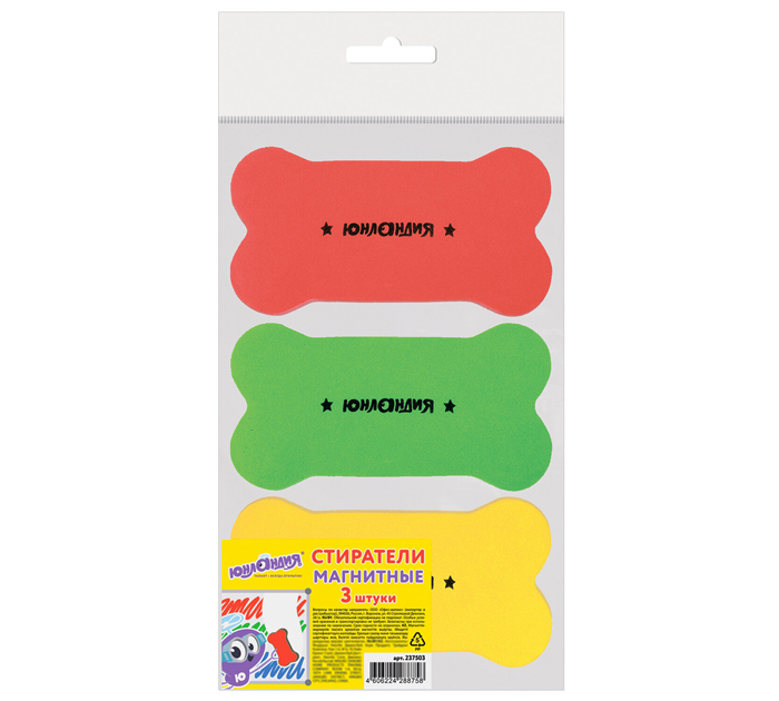Стиратели магнитные ЮНЛАНДИЯ предназначены для стирания сухим способом надписей, сделанных маркером, с белых досок. Встроенный магнит позволяет расположить стиратель в любом месте рабочей поверхности доски. Стиратель имеет эргономичную форму и необычный яркий дизайн. Размер - 55х110 мм. Стирающий слой выполнен из фетра. Поставляется в упаковке с европодвесом. В комплекте 3 стирателя: красного, желтого и зеленого цвета. Внимание: стирать надписи с доски рекомендуется лёгкими круговыми движениями., страна-производитель - Китай