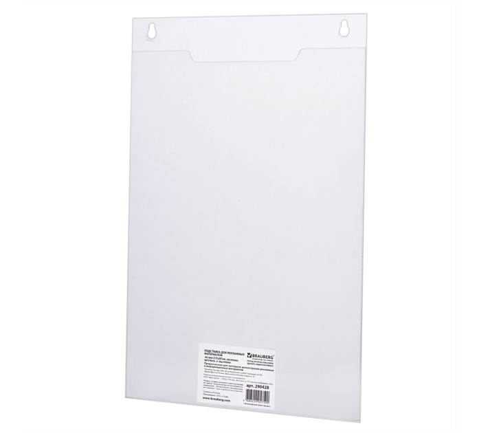Подставка BRAUBERG для размещения на стене рекламной или информационной листовки формата А4. Изготовлена из прозрачного акрилового стекла. Крепление на стену производится через два верхних отверстия или посредством самоклеящихся полосок на задней стенке подставки. Максимальная высота вставляемого листа 297 мм, максимальная ширина вставляемого листа 210 мм. Страна производитель - Россия.