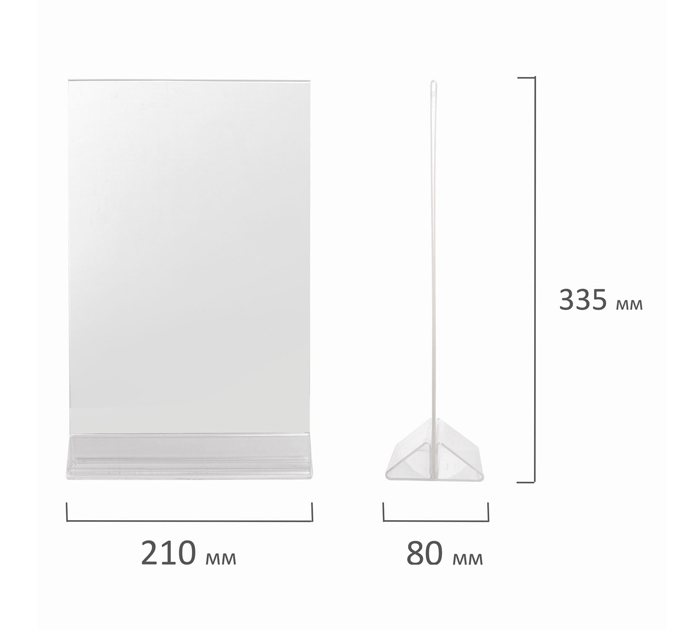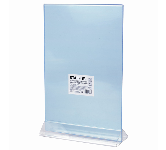 Двухсторонняя вертикальная настольная подставка STAFF подходит для размещения меню, рекламных материалов формата А4. Изготовлена из прозрачного акрилового стекла. Предназначена для настольного размещения. Упакована в полиэтилен. Страна производитель - Россия.
