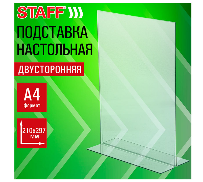 Двусторонняя вертикальная настольная подставка STAFF подходит для размещения меню, рекламных материалов формата А4. Подставка изготовлена из прозрачного ПЭТ. Предназначена для настольного вертикального размещения. Формат А4 и меньше. Максимальная высота вставляемого листа 297 мм, максимальная ширина вставляемого листа 210 мм. Перед первым применением удалите защитную пленку с изделия.Страна-производитель-Россия.