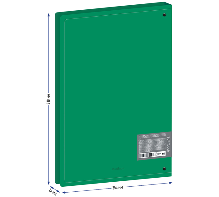 Папка на 4-х D-кольцах Berlingo серии Soft Touch формата А4 - стильный аксессуар для офиса и учёбы с плотной обложкой с приятной софт-тач фактурой. Изготовлена из высококачественного полипропилена толщиной 700 мкм с особой фактурой с эффектом софт-тач. Ширина корешка составляет 24 мм. Ширина папки составляет 250мм. Папка оснащена стильными черными кольцами, которые крепятся на заднюю стенку. Специальная D-форма колец диаметром 20 мм помогает удобно и ровно хранить документы, которые могут быть выровнены по левому краю, благодаря боковой вертикальной стенке кольца. Вместимость папки – 150 листов. На внутренней стороне обложки папка оснащена плотным прозрачным карманом для удобного хранения мелочей: ручки, заметок, визиток, дисков, флешек и др. Корешок папки оклеен специальным стикером для подписи содержимого, что позволяет легко и удобно организовывать документы на полке. Размер папки составляет 310х250х24 мм. Упакована в индивидуальный прозрачный пакет по форме. Папка оснащена съемным стикером с выходной информацией и штрих-кодом. Вместимость, в листах: 150. Формат: А4. Цвет: зеленый. Ширина корешка: 24 мм.