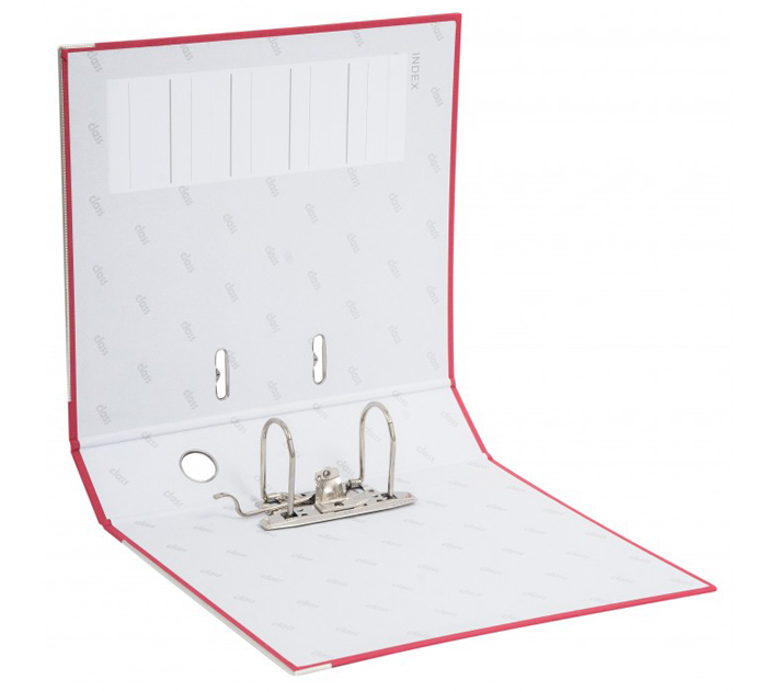 Папка-регистратор с арочным механизмом изготовлена из плотного картона, с внешней стороны покрыта защитным слоем поливинилхлорида. Формат А4. Нижние края папки защищены металлическим кантом. На корешке шириной 75 мм есть карман с маркировочной этикеткой и кольцо для удобного захвата.