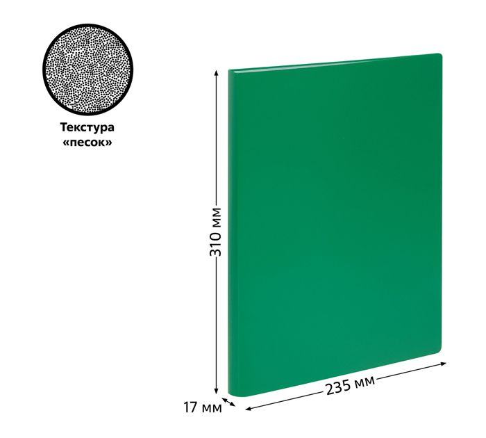 Папка с 30 вкладышами «СТАММ» предназначена для хранения бумаг формата А4. Цвет папки – зелёный. Папка изготовлена из качественного полипропилена плотностью 500 мкм с текстурой «песок». Тип скрепления – термосварка. Размер изделия составляет 310х235 мм. Ширина корешка – 17 мм. Бумагам, вложенным в папку, не требуется перфорация дыроколом. Папка упакована в индивидуальный пакет. Страна-производитель - РОССИЯ.
