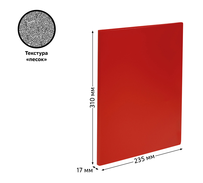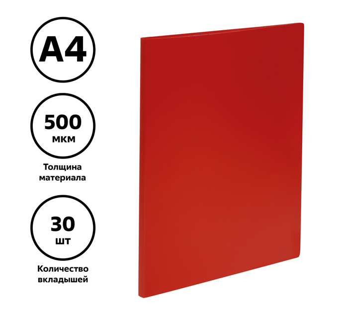 Папка с 30 вкладышами «СТАММ» предназначена для хранения бумаг формата А4. Цвет папки – красный. Папка изготовлена из качественного полипропилена плотностью 500 мкм с текстурой «песок». Тип скрепления – термосварка. Размер изделия составляет 310х235 мм. Ширина корешка – 17 мм. Бумагам, вложенным в папку, не требуется перфорация дыроколом. Папка упакована в индивидуальный пакет. Страна-производитель - РОССИЯ.