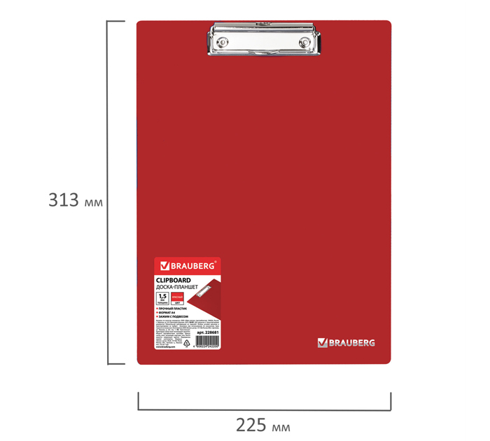 Сверхпрочная доска-планшет BRAUBERG «Contract» используется для работы с документами, накладными. Незаменим при работе на складе, магазине, участии в конференциях, выставках, а также для выступлений перед публикой. Удобно систематизировать документы. С верхним зажимом без крышки. Изготовлена из прочного пластика, толщина которого 1,5 мм. Доска-планшет формата А4 (313х225 мм) фиксирует до 90 листов. Металлический прижим с выдвижным подвесом обеспечит плотное прилегание документов. Выполнена в насыщенном красном цвете. Тип папки: без крышки. Формат: А4. Расположение прижима: верхний. Фиксирует до: 90 листов. Особенности: прижим с выдвижным подвесом. Серия: Contract. Материал: пластик. Покрытие: нет. Высота: 313 мм. Ширина: 225 мм. Толщина: 1.5 мм. Цвет: красный Бренд - BRAUBERG. Производитель - Россия.