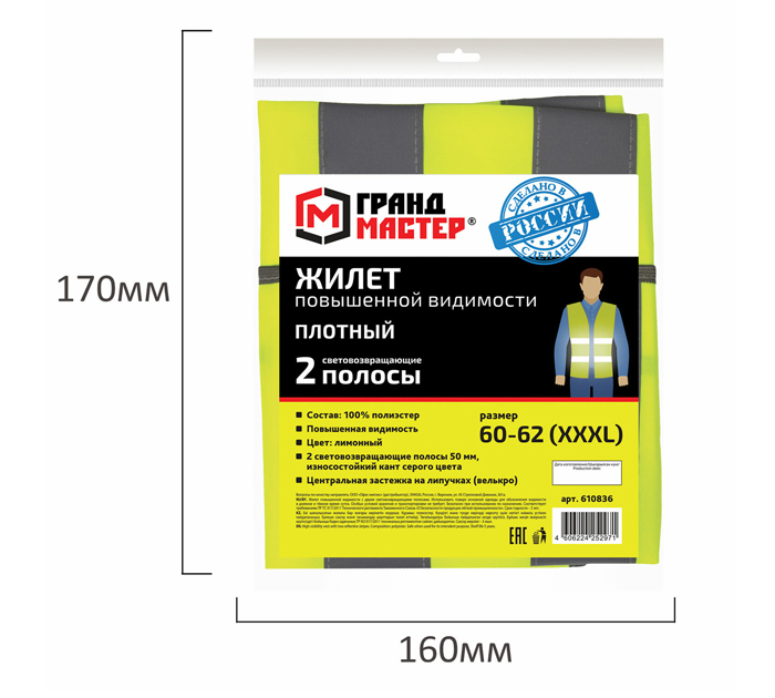 Сигнальный жилет незаменим при проведении любых ремонтно-строительных работ на проезжей части или железной дороге и в других опасных зонах. Рекомендован к использованию работниками коммунальных служб, водителями автомобилей, пешеходами и велосипедистами. Сочетание неонового лимонного цвета и светоотражающих полос обеспечивает его заметность как днем, так и в темное время суток. Жилет с центральной застежкой на ленту-липучку надевается поверх другой одежды. Изделие соответствует второму классу защиты, изготовлено из 100% полиэстера плотностью 120 г/м2. Ширина светоотражающей ленты – 50 мм. Универсальная модель подойдет по росту для среднего и высокого роста. В ней будет удобно как при росте 170 см, так и при 180 см.Используется на предприятиях для повышения безопасности персонала. Применение сигнальных жилетов существенно снижает риск получения травм при работе возле движущихся транспортных средств в условиях ограниченной видимости.Соответствует требованиям ТР ТС 017/2011 (Технический регламент Таможенного союза «О безопасности продукции легкой промышленности»)., страна-производитель - Россия