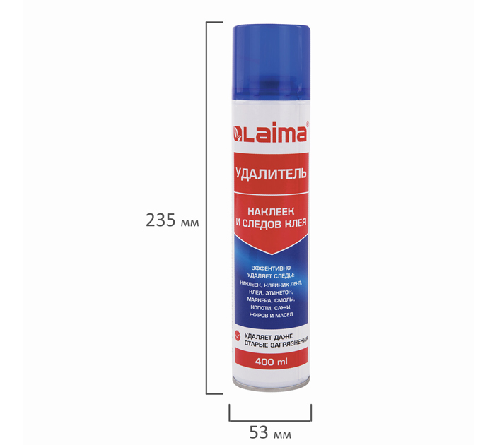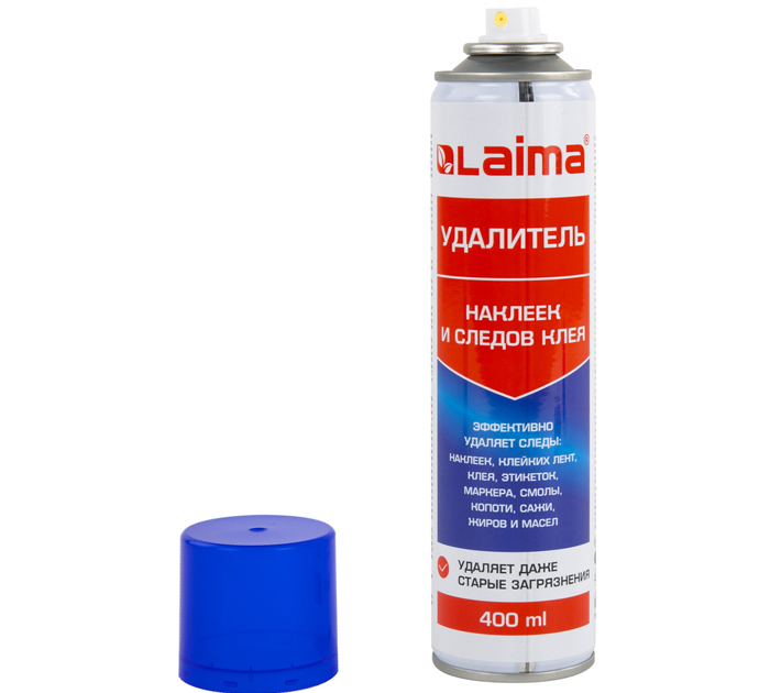 Средство LAIMA подходит как для быстрого и эффективного удаления остатков клейкой ленты, тонировочной пленки, информационных наклеек и рекламы, так и для очищения поверхностей от следов клея, маркера, смолы, копоти, сажи, жиров и масел. Средство обеспечивает быстрое и безопасное удаление остатков клея, клейких лент, самоклеящихся этикеток, наклеек, жевательной резинки и различных сложных промышленных загрязнений с твердых поверхностей в домашних условиях, офисе, на производстве. Гелеобразный тиксотропный состав после распыления не стекает с поверхности и эффективно растворяет остатки клея без повреждений и царапин на поверхности. Состав огнеопасен! Баллон необходимо предохранять от воздействия прямых солнечных лучей и нагревания свыше 50°С. Запрещается распылять вблизи источников открытого огня и раскаленных предметов! Использовать строго при выключенном оборудовании! Инструкция по применению: Перед использованием энергично встряхните баллон. Во избежание попадания следов аэрозоля защитите поверхности, не подвергающиеся обработке. Удалите следы загрязнений пластиковым скребком, тряпкой или вручную. Равномерно распылите состав на остатки клеевого слоя или загрязнений, дайте подействовать 30-40 секунд. Не допускайте длительный контакт состава с пластиковыми деталями. Удалите средство с помощью пластикового скребка, сухой тряпки или салфетки. Если этикетка или клейкая лента имеет влагоотталкивающий слой - предварительно удалите его так, чтобы средство могло проникнуть к клеевой основе. Следует соблюдать повышенную аккуратность при работе с окрашенными и ламинированными поверхностями! Состав: алифатические углеводороды более 30%, бутилацетат менее 30%, нафтеновые углеводороды менее 15%, гликолиевый эфир менее 15%, функциональные добавки менее 5%, ароматизирующая добавка менее 5%.Объем баллона составляет 400 мл. Внимание! Перед применением на пластиковых и окрашенных поверхностях рекомендуется протестировать на малозаметном участке (возможно повреждение поверхностей)!, страна-производитель - Россия