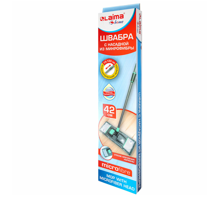 Швабра LAIMA HOME предназначена для проведения влажной и сухой уборки помещений. Можно применять для мытья вертикальных, горизонтальных поверхностей, напольных покрытий любого типа. Телескопическая ручка обеспечивает удобство в использовании. Насадка из микрофибры идеально удаляет загрязнения. Подвижное соединение ручки и держателя позволяет осуществлять уборку в труднодоступных местах.Крепление насадки - карманы. Крепление черенка – резьба длиной 1,6 см. Насадка выполнена из микрофибры, держатель – из пластика. Длина телескопической ручки из алюминия – 75-120 см., страна-производитель - Китай
