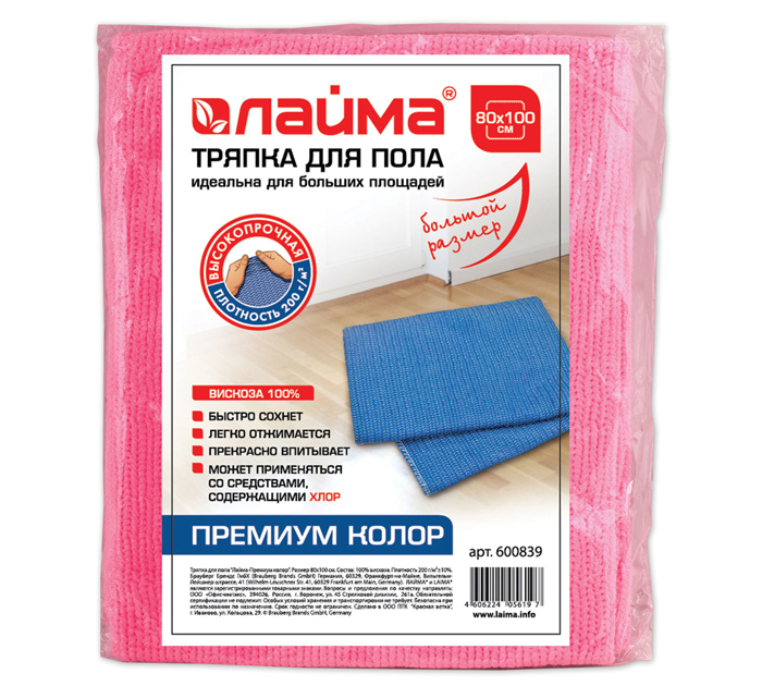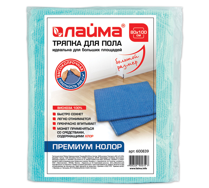 Тряпка для мытья пола LAIMA обладает высокой прочностью и увеличенным сроком службы. Прекрасно впитывает, отжимается, быстро сохнет. Идеальна для уборки больших площадей. Может применяться с бытовыми моющими средствами, включая хлорсодержащие. Выполнена из вискозы (холстопрошивное полотно). Стандартный размер 80х100 см. Долгий срок службы обеспечивает плотность 200 г/м2. Индивидуальная упаковка. Страна-производитель - Россия