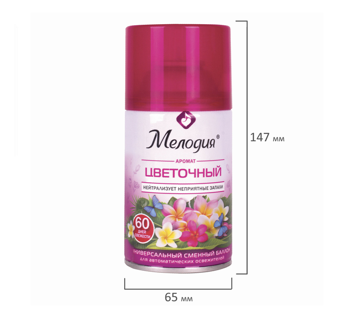 Сменный баллон МЕЛОДИЯ «Цветочный» быстро и эффективно устраняет неприятные запахи и освежает воздух в жилых и бытовых помещениях. Имеет приятный стойкий аромат, который надолго наполнит помещение свежестью. Универсальный сменный баллон подходит для автоматических освежителей Air Wick и Glade. Предназначен для постоянной ароматизации воздуха в любом помещении.Формула сухого распыления делает аромат более стойким и не оставляет брызг и пятен на полу и мебели, которые могут возникнуть при использовании аэрозолей, помогает быстро избавиться от неприятных запахов. Специальная конструкция распылителя обеспечивает более длительное использование освежителя. Объем картриджа - 250 мл. Страна-производитель - Россия