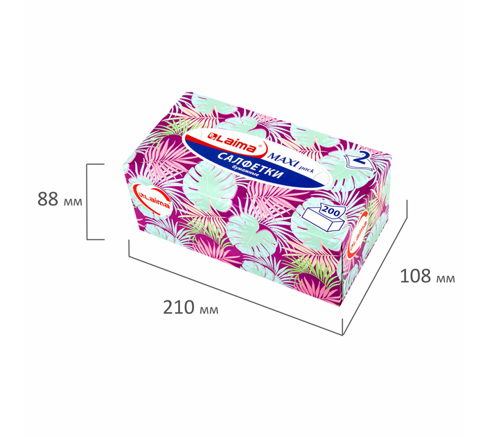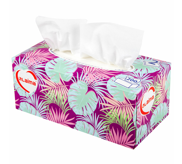 Салфетки в картонном боксе LAIMA практичны в применении. Их можно использовать не только дома, но и в офисе, на работе или взять с собой в дорогу. Предназначены для личной гигиены. В одной пачке 200 двухслойных салфеток белого цвета. Размер: 200 х 200 мм. Благодаря мягкой текстуре, салфетки не раздражают чувствительную кожу лица и носа. Особое применение найдут в парикмахерских и косметических салонах. Незаменимы в быту при снятии и нанесении макияжа, а также при возникновении простуды. Изготовлены из 100% целлюлозы. Не содержат спирт.Салфетки практичны в применении. Извлекаются по одной через клапан на верхней стороне коробки. Пользоваться салфетками удобно и легко - кончик следующей салфетки всегда выступает из коробки. Для удобства на задней стороне пачки имеются два поддерживающих элемента для салфеток. Когда салфетки будут заканчиваться, и возникнет вероятность того, что при выдергивании салфетки кончик последующей не будет выступать из клапана, просто нажмите в двух обозначенных местах по перфорации и поднимите с помощью этих элементов оставшиеся салфетки ближе к клапану.Салфетки упакованы в цветной картонный бокс, который станет ярким акцентом в любом интерьере., страна-производитель - Россия