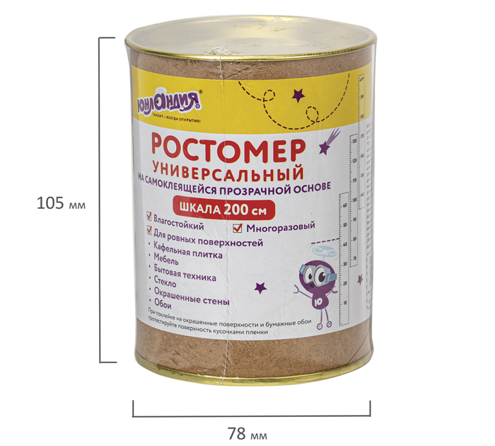 Ростомер универсальный Юнландия - наклейка для стен и мебели. Ростомер имеет оптимальные размеры по ширине и высоте, что позволяет органично вписаться в любой интерьер. Ростомер универсальный на самоклеящейся прозрачной основе, размер 7х201 см. Ростомер состоит из трех частей размером 7х67 см каждая, они крепятся на ровную поверхность путем стыковки. Вы можете наклеить лишь одну часть ростомера, и, по мере взросления ребёнка, добавлять оставшиеся части для отметки более высокого роста. Высококачественная ПВХ пленка водонепроницаема и долговечна в отличие от бумажных вариантов.Пленку необходимо снять с подложки и приклеить на стену, шкаф и другие ровные поверхности. На рельефных поверхностях наклейка может не удержаться. Перед тем как клеить наклейку на окрашенную стену или бумажные обои, рекомендуем протестировать поверхность кусочком пленки. Ростомер надежно упакован в тубус. Наклейку можно отклеивать и приклеивать на место несколько раз без потери качества клеевого слоя.