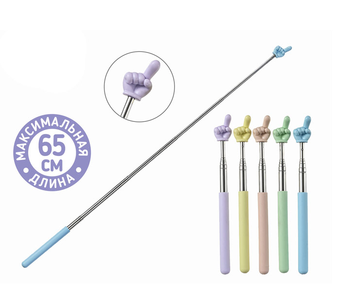 Указка телескопическая с пальцем, максимальная длина 65 см. Цвет в ассортименте. Размер упаковки: 6х2х26 см. Упаковка: пакет с европодвесом.