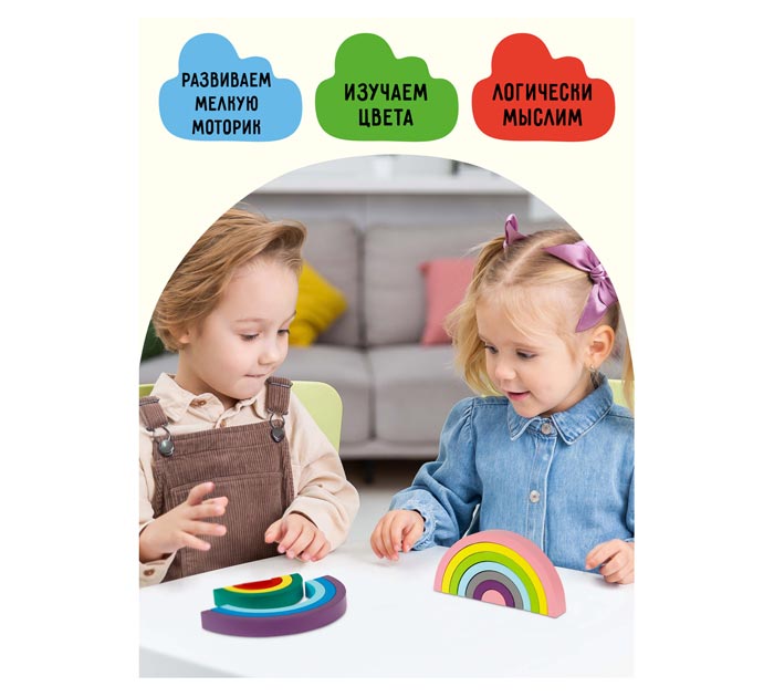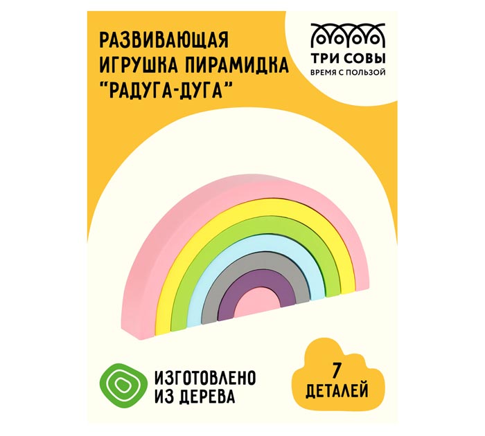 Деревянная игрушка «ТРИ СОВЫ» выполнена из экологичной древесины, покрыта безопасной для малышей краской на водной основе. Пирамидка «Радуга-дуга» состоит из семи элементов пастельных цветов радуги. Развивающая игрушка воспитывает в детях чувство цветовой гармонии, сортировке по размеру, логике и развивает воображение.Страна-производитель - РОССИЯ