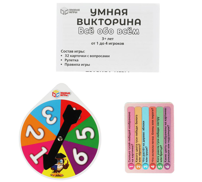 Умная викторина «Всё обо всём» ТМ «Умные игры» - увлекательное обучение в игровом формате по методике раннего развития. Данная викторина имеет три уровня сложности и предназначена как для индивидуальной игры, так и для игры в компании. Игра должна проходить при непосредственном участии взрослого. Размер упаковки: 240 x 180 x 55 мм. Материал: картон + пластмасса. Рекомендовано детям от 3-х лет.