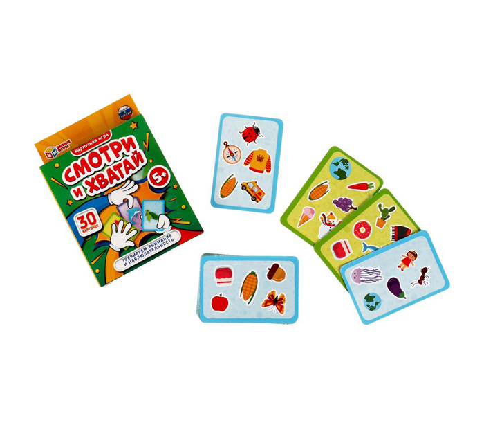 Карточная игра «Смотри и хватай» ТМ «Умные игры» поможет ребёнку увлекательно и с пользой провести время с друзьями или в кругу друзей. Особенности и комплектация: 30 двусторонних карточек, понятные правила игры, 2 варианта игры, количество игроков: от 2-х человек. Цель игры: заработать как можно больше баллов, находя отличия на карточках и хватая их быстрее других игроков. Благодаря компактному размеру набор можно взять с собой в поездку, чтобы весело скоротать время в дороге. Настольная карточная игра ТМ «Умные игры» развивает: скорость реакции, внимательность, память. Размер упаковки: 2 х 10 х 11 см. Материал: картон. Рекомендовано детям от 5-ти лет.