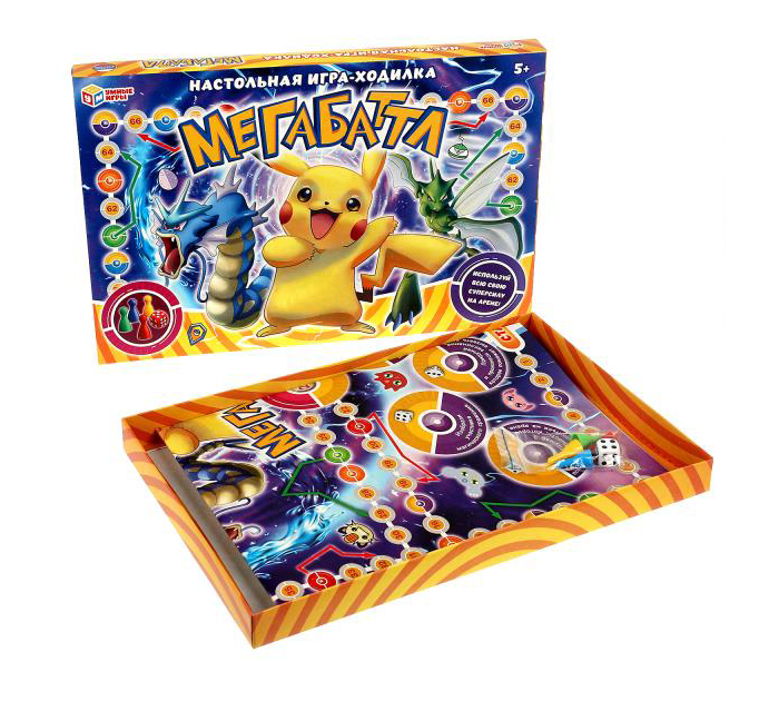 Настольная игра-ходилка «Мегабаттл» ТМ «Умные игры» - игра, в которой нужно использовать всю свою суперсилу, чтобы победить! Особенности: красочный дизайн, понятные правила игры на обороте упаковки, количество игроков: 2-4. Комплектация: картонное игровое поле размером 42 х 58 см, игральный кубик, 4 разноцветные пластиковые фишки. Добро пожаловать на ежегодную битву суперзверей! Сегодня мы узнаем, кто получит звание лучшего тренера. Бросайте кубик, передвигайте фишки и используйте свою суперсилу, чтобы выполнить задания и прийти к финишу первым. Соревнования начинаются! ЦЕЛЬ ИГРЫ. Участники кидают кубик и ходят вперёд на выпавшее количество клеток, стремясь первым попасть на финиш и выиграть. ПОДГОТОВКА К ИГРЕ. В игре могут принимать участие от 2 до 4 человек. Игроки выбирают себе фишки и ставят их на старт. Чтобы определить очерёдность хода, все участники бросают кубик. Первым ходит тот, у кого выпало наибольшее количество очков. Далее по часовой стрелке. ХОД ИГРЫ. Игроки по очереди бросают кубик и передвигают свою фишку на выпавшее на нём количество ходов. Игроки могут выбрать любую дорожку (пойти направо или налево) по своему желанию. В зависимости от поля, на котором остановилась фишка, участник выполняет разные действия: переходит по стрелке вперёд; возвращается по стрелке назад; пропускает следующий ход; бросает кубик и, в зависимости от выпавшего количества очков, выполняет нужное задание на круге фиолетового цвета; бросает кубик и, в зависимости от выпавшего количества очков, выполняет нужное задание на круге голубого цвета; после прохождения этой клетки игрок может снова выбрать, по какой дорожке от отправится дальше к финишу. ПОБЕДИТЕЛЬ. Выигрывает тот, кто первым доберётся до финиша. Игра-ходилка ТМ «Умные игры» развивает: ориентацию на плоскости, внимание, визуальное восприятие, логику, социально-коммуникативные навыки. Размер упаковки: 217 х 330 х 27 мм. Материал: пластмасса + картон. Рекомендовано детям от 5-ти лет.