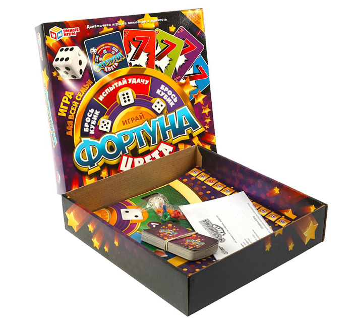 Настольная игра-ходилка «Фортуна цвета» ТМ «Умные игры» - отличное времяпровождение для небольшой компании. Особенности: красочный дизайн; количество игроков: 2-4; продолжительность игры: от 30 минут. Состав игры: игровое поле; 40 карт с цифрами: 16 карт «Фортуна», 8 карт «3+», 8 карт «Пропуск хода», 8 карт «Смена направления»; 4 фишки и 1 игровой кубик; правила игры. ЦЕЛЬ ИГРЫ. Заработать наибольшее количество победных очков. Перед началом игры необходимо разрезать игровые карточки по пунктирной линии. ПОДГОТОВКА К ИГРЕ. Разложите игровое поле в центре стола. Поставьте фишки на клетку «100», она будет считаться стартом. Тщательно перемешайте колоду карт и положите рядом с полем. Раздайте каждому игроку по 6 карточек рубашкой вверх. Одна карта из колоды кладётся в центр игрового поля лицевой стороной вверх. Это обязательно должна быть карта с цифрой. Карты с бонусами, «Фортуна», «Смена направления», «Пропуск хода» в данном случае не подойдут. Если же выпала карта не с цифрой, из колоды выкладывается следующая карта, а первая возвращается в середину колоды. ХОД ИГРЫ. Решите любым удобным для вас способом, кто будет ходить первым. Далее право хода передаётся по часовой стрелке. В свой ход игрок выкладывает одну из своих карт лицом вверх на карту в центре поля. Выложенная карта игрока должна соответствовать первой по цвету или по цифре. Например, на зелёную карточку с цифрой «7» можно положить любую зелёную карту (в том числе «Пропуск хода» и «Смена направления»), либо «7» любого другого цвета. Если у игрока на момент его хода нет подходящей карты на руках, он берёт одну карту из колоды рубашкой вверх. Если эта карта подходит, игрок выкладывает её в центр поля, если нет - оставляет эту карту себе и говорит «Пас». После этого право хода предоставляется следующему игроку. В ходе игры участники отмечают фишкой на дорожке по контуру поля количество заработанных очков (количество очков за карты смотреть дальше). Например, если участник выложил карту, за которую даётся семь очков, он передвигает свою фишку на семь клеток вперёд. Когда у кого-то из игроков на руках остаётся одна карта, он должен громко произнести «Фортуна». Успеть сказать «Фортуна» необходимо тогда, когда игрок начал выкладывать предпоследнюю карту. Если он не сказал этого, а у него на руках осталась одна карта, то любой из соперников может произнести «Фортуна». В этом случае игрок, оставшийся с одной картой и не произнёсший нужного слова, должен взять из колоды две карты. Важно! Все игроки должны держать руки с картами на виду, чтобы участники видели количество карт друг друга, и в случае, если кто-то забудет сказать «Фортуна», могли подловить его на этом. ЗАВЕРШЕНИЕ ИГРЫ. Игра заканчивается тогда, когда кто-то из участников избавился от всех своих карт. Победителем же считается игрок, набравший на момент окончания игры наибольшее количество победных очков. Игра-ходилка развивает: внимательность; логику; социально-коммуникативные навыки. Размер упаковки: 250 х 250 х 55 мм. Материал: пластмасса + картон. Рекомендованный возраст: 6+.
