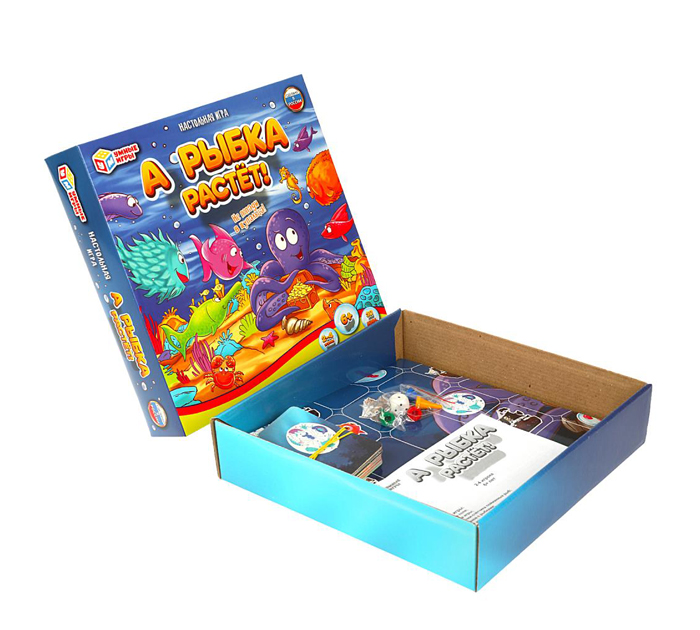 Добро пожаловать в подводный мир! В настольной игре «А рыбка растёт» вам предстоит выращивать своих рыбок и ловить питомцев своих соперников. Исследуйте морские глубины, прячьтесь в затонувших кораблях и кормите своих рыбок. Постарайтесь не встретиться с осьминогом: его щупальца очень опасны для ваших маленьких подопечных. Перемещайтесь по игровому полю и выполняйте специальные задания. Победит тот игрок, кто первым поймает 9 рыбок других игроков. Кто же первым узнает все тайны подводного мира и поймает всех рыбок соперника? Бросайте кубик, игра начинается! Игра подойдет: 1) Компании друзей – элемент соревнования добавит встрече много ярких эмоций! 2) Для семейного времяпровождения – эта увлекательная игра поможет развить логику, пространственное и стратегическое мышление. ОСОБЕННОСТИ: количество игроков: 2-4; продолжительность игры: от 30 минут; рекомендованный возраст: 6+. СОСТАВ ИГРЫ: игровое поле; 4 карточки-счётчика пойманных рыб; 48 жетонов с рыбами; 28 карт морских тайн (со знаком вопроса на рубашке); 4 фишки и 1 игральный кубик; правила игры. Размер упаковки: 250 х 250 х 55 мм.