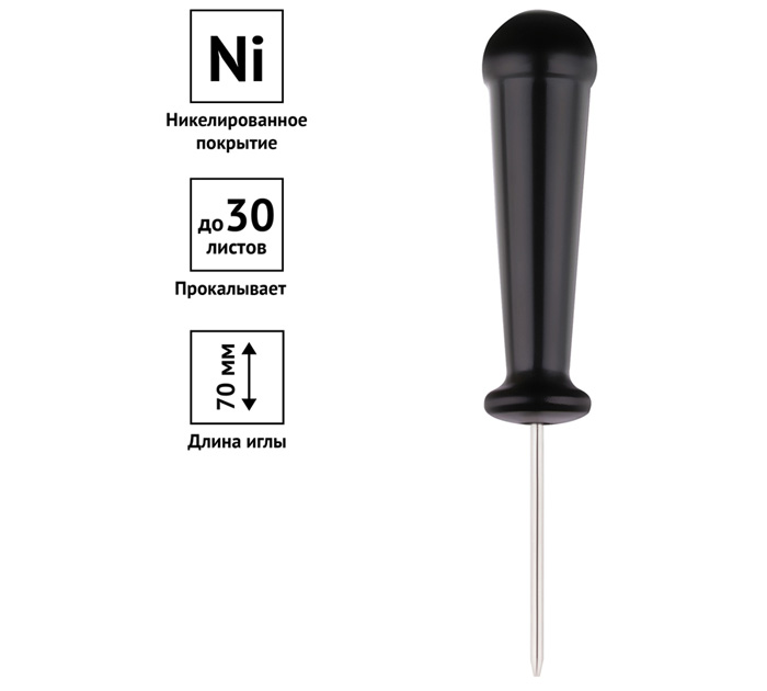 Большое канцелярское шило используется для прошивки документов и прокалывания бумаги. Цвет пластиковой рукоятки - черный. Диаметр шила 3 мм, длиной 70 мм, общая длина шила 150 мм. Имеет никелевое покрытие. Изделие может обеспечить прокалывание до 30 листов бумаги за один прокол.