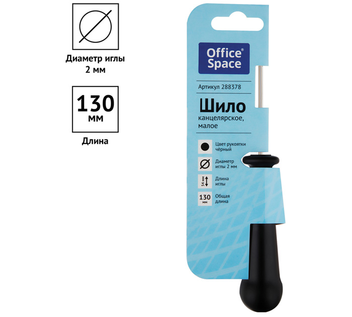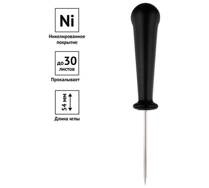 Малое канцелярское шило используется для прошивки документов и прокалывания бумаги. Цвет пластиковой рукоятки - черный. Диаметр шила 2 мм, длиной 54 мм, общая длина шила 130 мм. Имеет никелевое покрытие. Изделие может обеспечить прокалывание до 30 листов бумаги за один прокол.