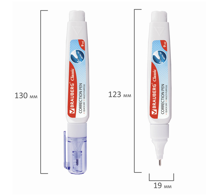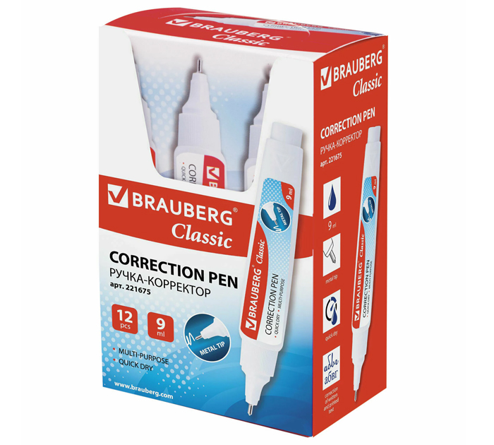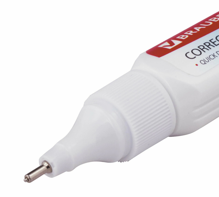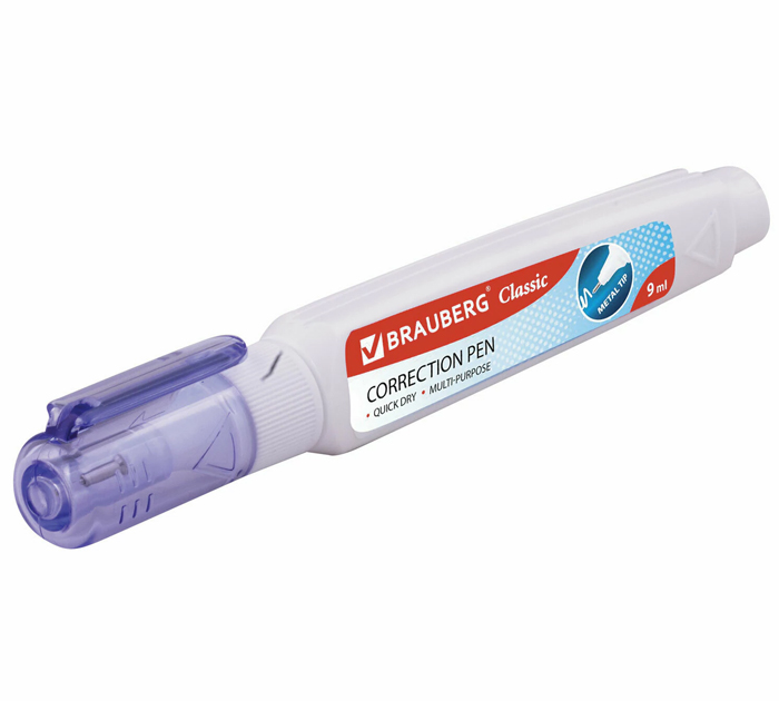 Ручка-корректор BRAUBERG предназначена для точных исправлений текста на любых типах бумаги. Быстросохнущий корректор на спиртовой основе имеет объем 9 мл и обладает устойчивостью к морозу. Надежный металлический наконечник обеспечивает экономичный расход корректирующей жидкости. Корректирующая ручка оснащена клапанным механизмом, и подача жидкости осуществляется с помощью нажатия на наконечник ручки. Перед началом использования ОБЯЗАТЕЛЬНО встряхните ручку. На корпус ручки не следует оказывать повышенное физическое давление, за исключением случаев, когда ручкой давно не пользовались., страна-производитель - Китай