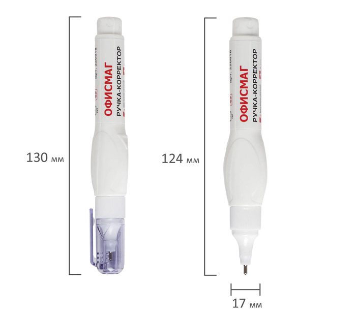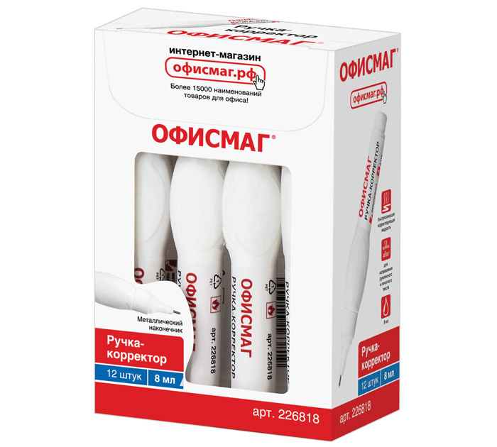 Ручка-корректор ОФИСМАГ идеально подходит для точных исправлений текста на любых типах бумаги. Быстросохнущая корректирующая ручка на спиртовой основе имеет объем 8 мл и обладает устойчивостью к морозу. Корректор оснащен клапанным механизмом, и подача жидкости осуществляется с помощью нажатия на наконечник ручки. Самопроизвольно жидкость не вытекает из ручки. Не оказывайте на корпус ручки повышенное физическое давление, за исключением случаев, когда ручкой давно не пользовались. Перед началом использования ОБЯЗАТЕЛЬНО встряхните ручку, страна-производитель - Китай.