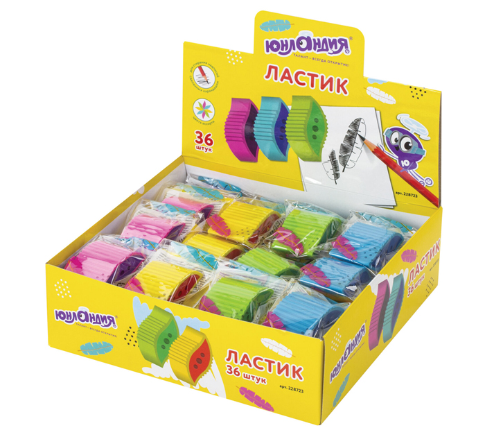 Ластик Юнландия «Листочки» предназначен для удаления надписей, сделанных чернографитным карандашом. Имеет необычную форму, повторяющую форму листочка, и сочетает в себе несколько цветов ассорти. Ластик обеспечит лёгкое и чистое стирание без повреждения поверхности бумаги и без образования бумажной пыли. Размер - 48х27х17 мм. Поставляется в картонном дисплее. Пиши, стирай вместе с ластиком Юнландия «Листочки»!