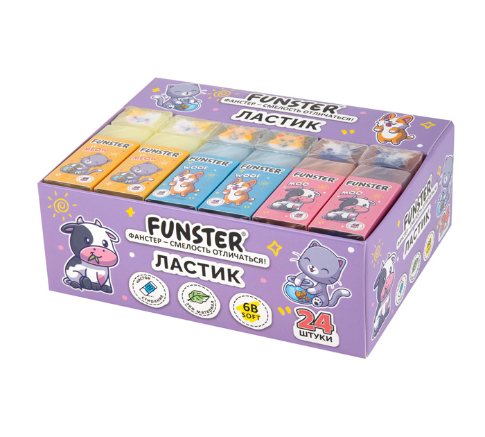 Ластик FUNSTER «PETS» предназначен для удаления надписей, сделанных чернографитными карандашами. Ластик FUNSTER (ФАНСТЕР) «PETS» имеет удобную прямоугольную форму. Картонный рукав позволит надолго сохранить ластик чистым при использовании и не даст испачкаться в пенале или на столе. Забавные персонажи в виде собаки, котёнка и коровы вызывают улыбку и превращают стирание в весёлое занятие. Ластики выполнены из безопасного нетоксичного материала, они обеспечат чистое стирание без крошек и разводов на бумаге. Размер – 50х21х16 мм., страна-производитель - Китай