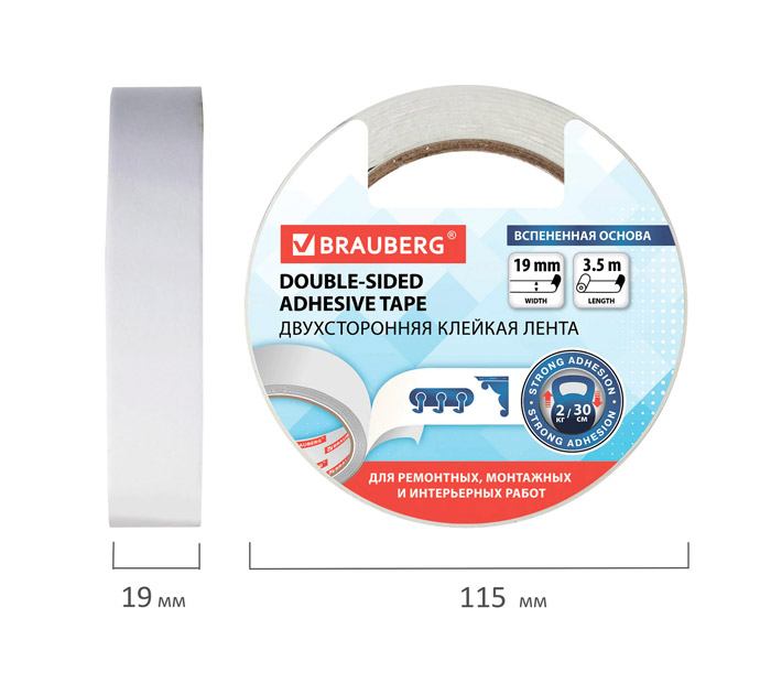 Двухсторонняя клейкая лента BRAUBERG на основе вспененного полиэтилена применяется во время мотажных работ внутри помещений, при строительных, и автомобильных работах. Изготовлена на основе ЭВА. Длина - 3.5 м, ширина - 19 мм, толщина - 1000 мкм, цвет - белый. Лента с клеевым слоем обеспечивает отличную адгезию скрепления пластиковых профилей, металлических пластинок, панелей, табличек, эмблем, ценников, керамики, дерева, картона. Рабочая температура: от -10 до +50 градусов. Упакована в термоусадочную пленку с этикеткой на каждом ролике. Страна-производитель - Китай
