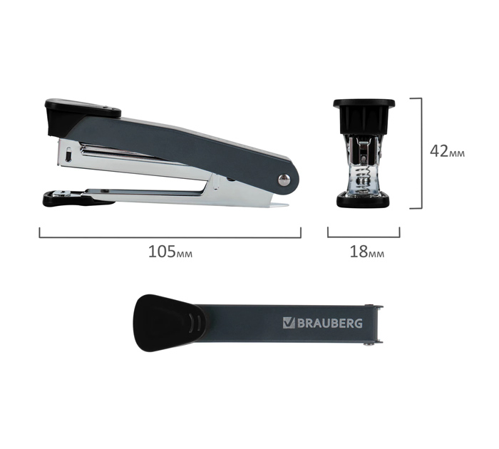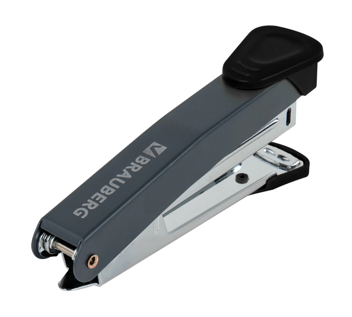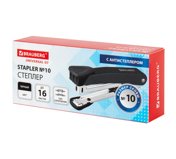 Настольный степлер BRAUBERG «UNIVERSAL GT» № 10 в металлическом корпусе с металлическим механизмом предназначен для надежного и качественного скрепления документов в офисе и дома. Степлер способен скреплять до 16 листов и использует скобы №10. Виды сшивания: закрытый и прямой. Глубина закладки бумаги — 60 мм. Благодаря компактным размерам он удобен в использовании и занимает минимум места на рабочем столе. Классический дизайн делает степлер идеальным дополнением к любому интерьеру. Продается в картонной упаковке. Страна производитель - Китай.