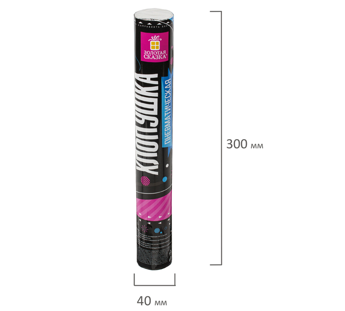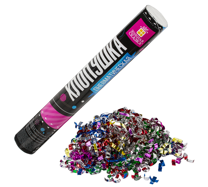 Пневматическая хлопушка ЗОЛОТАЯ СКАЗКА предназначена для создания отличного настроения и атмосферы настоящего веселья на любом празднике - новогодней вечеринке, торжестве в честь Дня Рождения, выпускном, корпоративе или любом другом праздничном событии. Хлопушка высотой 30 см с фольгированным наполнителем в виде серпантина и конфетти цвета ассорти является абсолютно безопасной. Выстрел осуществляется под действием сжатого воздуха. Не является пиротехникой. Средняя дальность выстрела – 5-7 м. Корпус хлопушки состоит из двух частей: пневматического баллона со сжатым воздухом и картонного цилиндра с наполнителем. Рекомендуется использовать хлопушку внутри больших помещений или на улице. Тип: пневматическая. Длина: 30 см. Количество в комплекте: 1 шт. Материал наполнителя: фольга. Основной наполнитель: серпантин. Цвет наполнителя: ассорти. Бренд - ЗОЛОТАЯ СКАЗКА. Производитель - Китай.