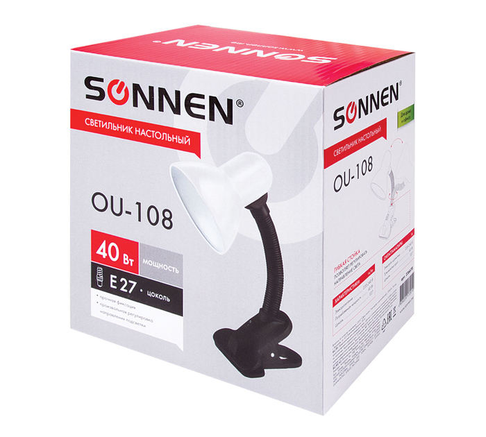 Настольная лампа-светильник Sonnen OU-108 является незаменимым атрибутом рабочего места. Прекрасно подойдет для школьника, студента, офисного менеджера. Произвольная регулировка направления света поможет подобрать наиболее оптимальный угол освещения. Для светильника высотой 30 см подходит любая технология бытовых ламп (накаливания, люминисцентная, светодиодная) с цоколем Е27, благодаря чему можно самостоятельно выбрать яркость и оттенок света. При использовании лампы накаливания, максимальная мощность не должна превышать 40 Вт. Корпус из пластика представлен в предельно простом черно-белом дизайне, благодаря которому он гармонично впишется в офисный или домашний интерьер. Лампа крепиться с помощью прищепки. Лампочка в комплект не входит. Электропитание 220-240 В / 50-60 Гц. Номинальная мощность 40Вт.