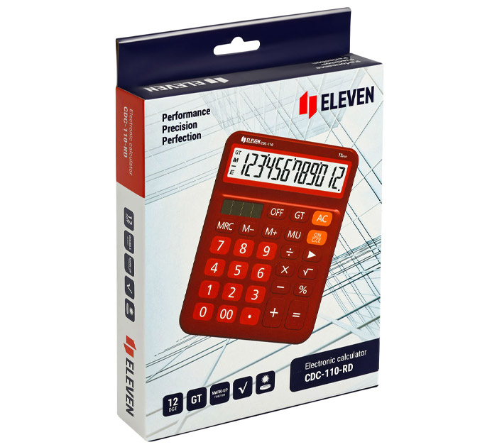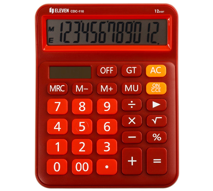 12-ти разрядный настольный калькулятор Eleven CDC-110-RD предназначен для выполнения арифметических операций. Размер калькулятора – 125х160х28 мм, вес – 140,9 г, цвет – красный. Оптимальный набор функций поможет автоматизировать расчёты: функция Grand Total (общая сумма), коррекция последнего введенного значения, расчёт наценки, кнопка «00». Двойное питание (солнечная батарея + батарея LR1130) и автоматическое отключение увеличивают срок службы. Упакован в картонную коробку. Страна-производитель - КИТАЙ.