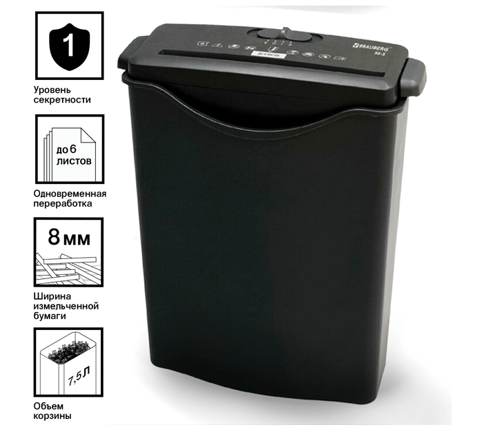 Уничтожитель для бумаг Brauberg «S6-S» 1 уровень секретности, полоски 8мм, 6 листов, 7,5л