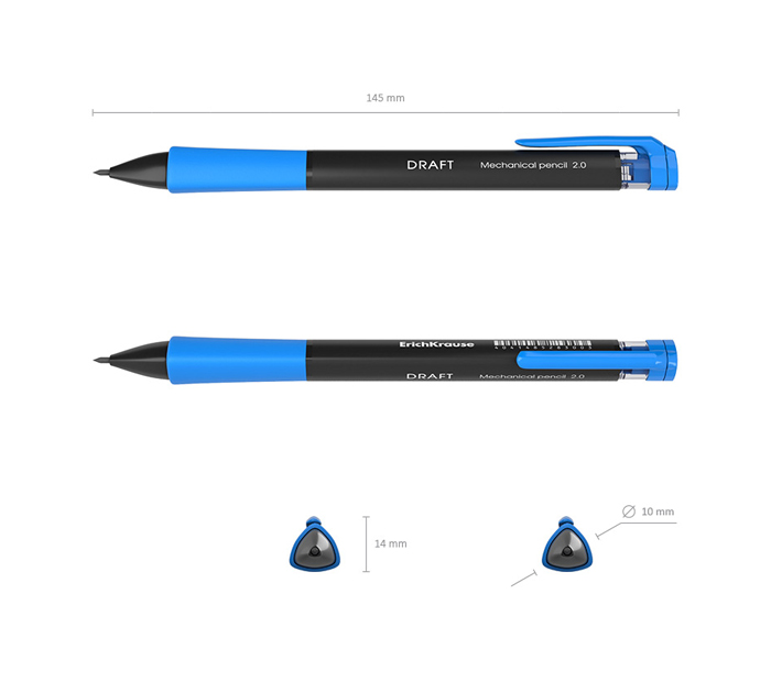 Механический карандаш эргономичной треугольной формы с удобной профилированной грип-зоной из резины. Оснащен точилкой. Твердость HB. Диаметр грифеля - 2.0 мм.