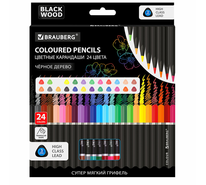 Карандаши цветные Brauberg «Black wood» 24 цвета, супер мягкий грифель