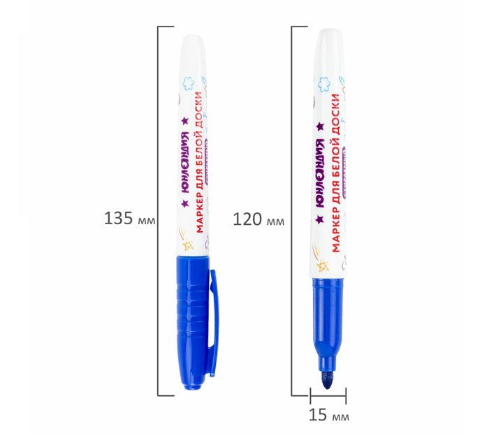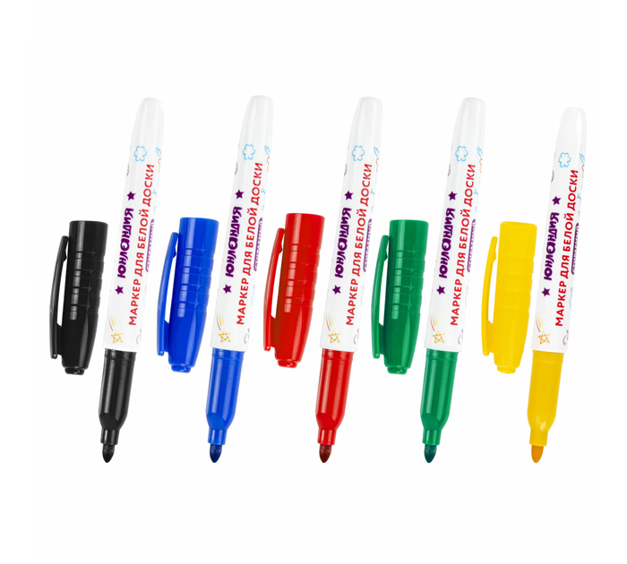 Набор стираемых маркеров для доски ЮНЛАНДИЯ предназначен для использования на изделиях с магнитно-маркерной поверхностью и стекле. Идеально подходит для рисования, игр, визуализации учебных процессов. 5 цветов в наборе: черный, красный, синий, зеленый, желтый. Круглый пластиковый корпус с ярким дизайном имеет диаметр 15 мм. Наконечник круглой формы обеспечивает толщину линии письма 3 мм, что позволяет писать крупным шрифтом, который будет хорошо виден. Основа чернил - спиртовая. Чернила быстро высыхают и легко стираются сухой губкой, не оставляя разводов. Изделие не перезаправляется. Цвет колпачка и клипа соответствует цвету чернил. Страна-производитель - Китай