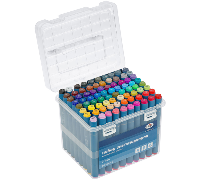 Набор двусторонних маркеров для скетчинга ГАММА серии «Студия» – выбор профессионалов, любителей и начинающих художников, дизайнеров и иллюстраторов. В наборе 80 основных цветов. Перманентные чернила на спиртовой основе не токсичны и быстро сохнут на поверхности, оставляя яркий след. Маркеры на спиртовой основе имеют два наконечника: пулевидный с шириной линии 1 мм и долото (клиновидный) 2-6 мм. Пулевидный наконечник подойдет для прорисовки деталей, работ в различных графических техниках, создания текстур и проработки контуров. Клиновидный наконечник идеален для работ на больших поверхностях и тех, кто занимается каллиграфическими техниками, так как он позволяет варьировать ширину линии. Маркеры для рисования мягко ложатся на поверхность, создавая ровный цвет без разводов. Цвета отлично смешиваются между собой, образуют плавные переходы и новые оттенки. Маркерами можно рисовать на бумаге, холсте и других поверхностях. Трехгранный матовый корпус диаметром 1, 55 мм из полипропилена нежно-голубого цвета легкий и ударопрочный. Плотно защелкивающийся колпачок обеспечивает долгую сохранность чернил от высыхания. Также на нём указан номер цвета. Маркерам не страшны морозы, так как спирт замерзает только при температуре –114 °C. Набор упакован в пластиковый кейс с разделителями и защелками.