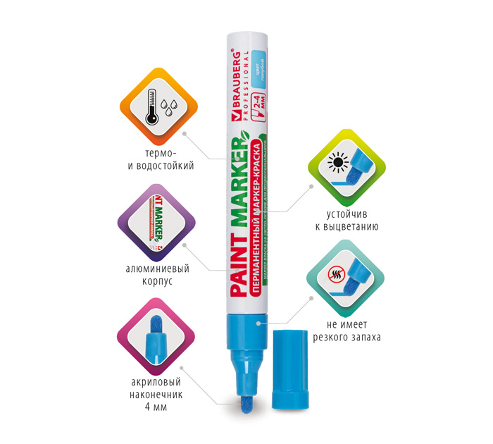 Маркер-краска лаковый Brauberg предназначен для маркировки различных материалов в промышленных условиях: бетона, дерева, стекла, металла, резины, пластика. Также подходит для творчества и декорирования. СПОСОБ ПРИМЕНЕНИЯ: 1. Перед использованием хорошо встряхнуть с закрытым колпачком. 2. Снять колпачок, надавить на наконечник, дождаться, когда краска полностью пропитает его. 3. После использования плотно закрыть колпачок. Чернила с лаковым эффектом производства компании Multichem не содержат ксилол, являясь экологичными и безопасными для окружающей среды. Не имеют резкого запаха нитро-краски в отличие от большинства аналогов, что позволяет использовать данный маркер в закрытых помещениях без вреда для здоровья. Отличаются термо- и водостойкостью, устойчивы к выцветанию. Пишет по сухим, жирным, грязным, ржавым поверхностям. Ширина линии письма составляет 2-4 мм. Прочный круглый наконечник выполнен из пористого акрила. Алюминиевый корпус.