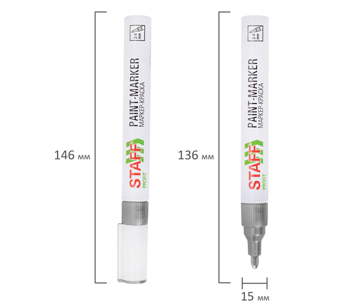 Маркер-краска лаковый STAFF PROFIT предназначен для маркировки различных поверхностей: бетон, дерево, стекло, металл, резина, пластик. Подходит для использования как в промышленных, так и в бытовых целях. СПОСОБ ПРИМЕНЕНИЯ:1. Перед использованием хорошо встряхнуть с закрытым колпачком.2. Снять колпачок, надавить наконечником на поверхность.3. Подождать 20 секунд, когда краска полностью пропитает наконечник.4. После использования плотно закрыть колпачок.Высококачественные чернила серебристого цвета с лаковым эффектом идеально подходят для нанесения долговечной маркировки на любые поверхности. Благодаря усиленной формуле чернил краска ложится ровным слоем, полностью закрашивая поверхность. С помощью круглого прочного наконечника, выполненного из пористого акрила с шириной линии письма 2-4 мм, можно легко наносить широкие линии равномерным и однородным слоем. Быстросохнущие чернила предотвращают смазывание в процессе маркировки. После высыхания надписи становятся термо- и водостойкими, а также устойчивыми к выцветанию и механическому истиранию. Отлично подходит для маскировки бытовых дефектов, таких как царапины и сколы. Надежный помповый механизм подачи чернил предотвращает вытекание и разбрызгивание в процессе использования, а также преждевременное высыхание. Корпус маркера выполнен из алюминия, внутри находятся 2 металлических шарика для взбалтывания краски. Цвет колпачка соответствует цвету чернил.Это товар эконом-сегмента, поэтому он отличается привлекательной ценой. Товар обладает базовым набором характеристик и простой упаковкой, при этом полностью соответствует основным требованиям потребителей., страна-производитель - Китай