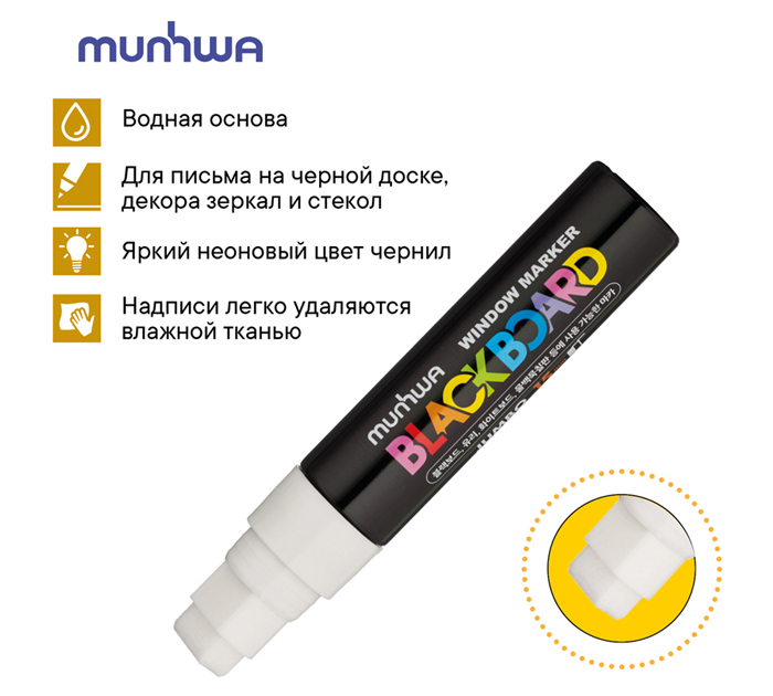 Маркер меловой MunHwa «Black Board Jumbo » - жидкий мел на водной основе. Маркер рекомендуется к использованию на белых и черных досках, для декорирования зеркал и стекол, оформления окон, для нанесения надписей на металл, пластик и другие ГЛАДКИЕ поверхности. Маркеры, нанесенные на гладкую поверхность, можно удалить влажной тканью. Благодаря высококачественному механизму и составу, мел поступает дозированно, ложится на поверхность равномерным и однородным слоем, полностью закрашивая обрабатываемую поверхность. Меловой маркер - не крошится, не осыпается при нанесении и не пачкает руки. Клапанный механизм пишущего узла исключает растекание и разбрызгивание мела, преждевременное пересыхание маркера. Маркеры НЕ рекомендуется использовать по шершавым, пористым поверхностям (частицы краски забьются в поры и не ровности откуда их сложно будет извлечь). Меловой маркер идеальный инструмент для детского творчества. «Black Board Jumbo» имеют яркие неоновые цвета, которые особенно эффектно сморятся на темных поверхностях. Меловой маркер MunHwa «Black Board Jumbo» - это твой помощник для воплощения всех креативных решений в жизнь. Инструкция по применению: 1) Встряхнуть маркер с закрытым колпачком. 2) Открыть колпачок. Удерживая маркер в вертикальном положении, несколько раз надавить стержнем на поверхность до тех пор, пока краска не поступит на пишущих узел. 3) Выполнить надпись или рисунок. Дать составу высохнуть в течение 40-60 секунд. 4) Плотно закрыть колпачок.